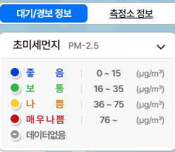 | 나쁨 | 36-75 | KF94 마스크 필수, 야외활동 줄이기 |